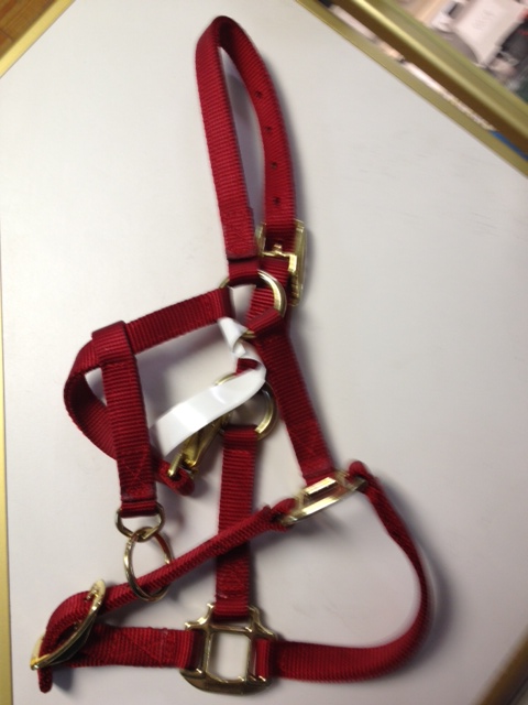 This halter is a durable 2-ply nylon webbing with 3-ply cheeks. Heavy Brass Hardware on snap and throat and adjustable nose. It comes with a lifetime warranty against breakage when breakage occurs under normal use. Made in the USA