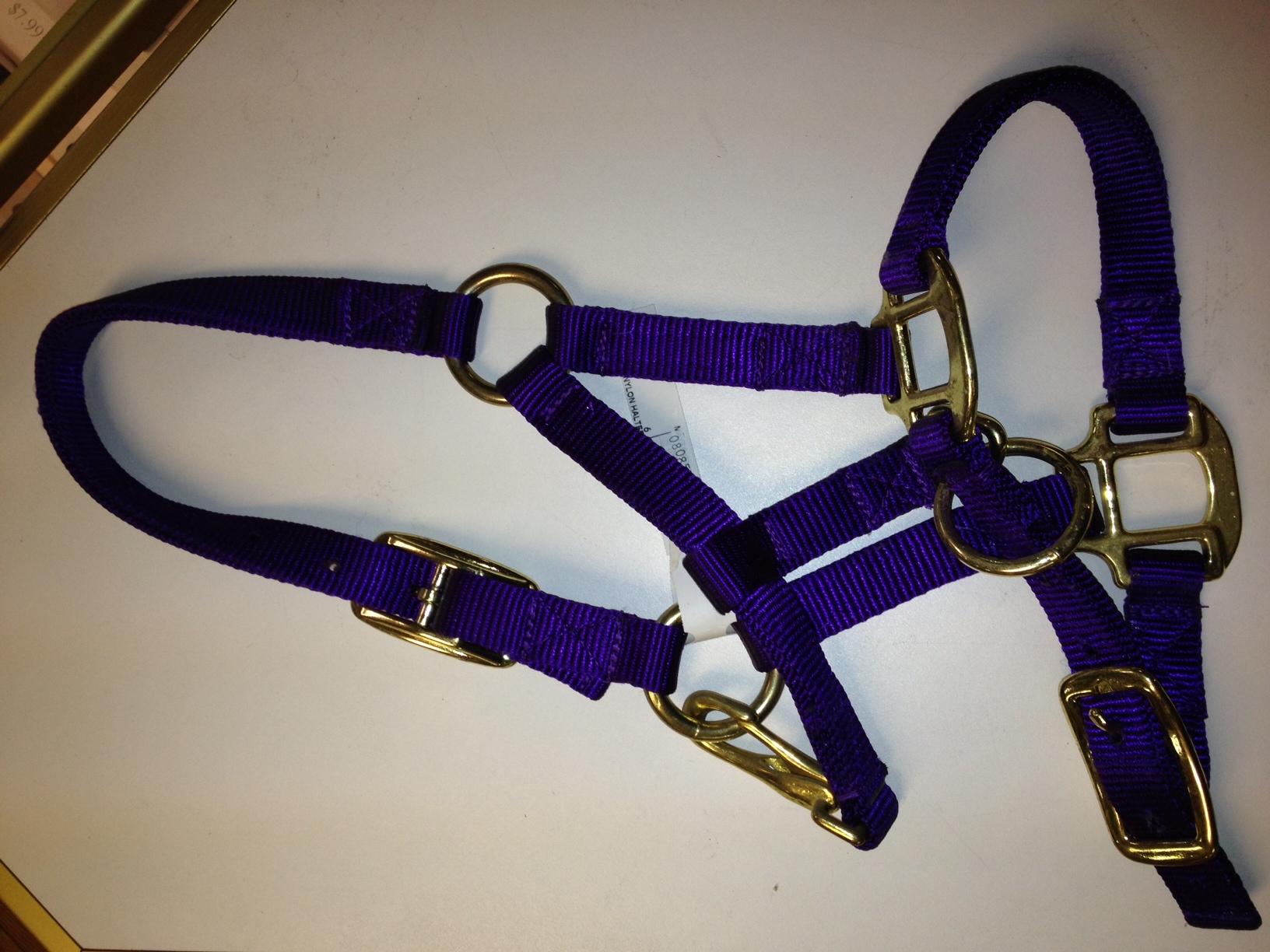 This halter is a durable 2-ply nylon webbing with 3-ply cheeks. Heavy Brass Hardware on snap and throat and adjustable nose. It comes with a lifetime warranty against breakage when breakage occurs under normal use. Made in the USA
