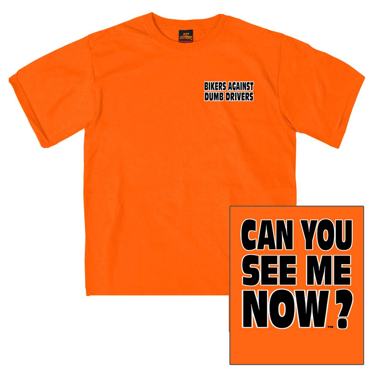 Bikers Against Dumb Drivers (left chest print); Can You See Me Now? (large back print) - Front and Back Printed Safety Orange T-Shirt - Make sure they see you on the road! Shirts are made with 50% heavyweight cotton/50% polyester pre-shrunk and offer quality construction with bright screen print on front and back.