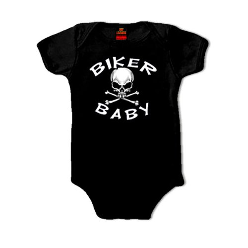 Biker Baby Onesie- Turn your baby into an instant biker! Black onesie with skull and crossbones on front with the words "Biker Baby". Cotton body with snap crotch. This product has been tested and meets or exceeds CPSC and CPSIA compliance requirements.