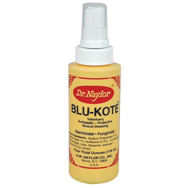 Blu-Kote is a germicidal, fungicidal wound dressing and healing aid effective against both bacterial and fungus infections most common in skin lesions of domestic animals. Kills ringworm and fungus infections. Dries up blisters and pox-like scabby sores or lesions.