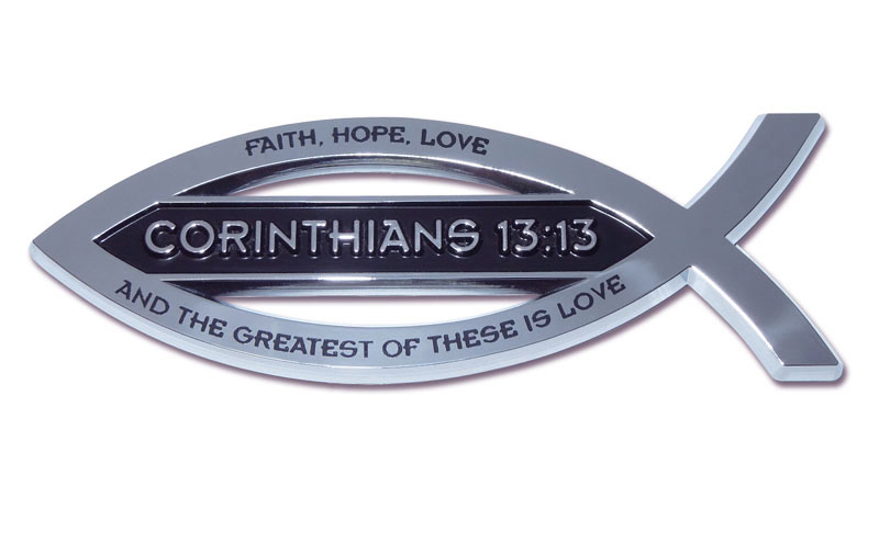 Christian Fish Chrome Auto Emblem (Corinthians 13:13 w/ Scripture)