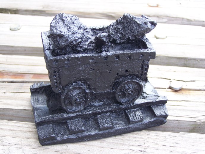This unique figurine is a handcrafted coal cart on tracks made from coal in Kentucky. The rustic/primitive style adds to its charm, and the black color of the coal perfectly complements any home decor. The figurine is expertly crafted and features intricate details that showcase the skill of the artisan who made it. Made in the United States, this figurine is a perfect addition to any collection of sculptures and figurines. It is an excellent conversation piece and a thoughtful g ift for anyone interested in coal mining or the history of Kentucky. Add this beautiful, one-of-a-kind piece to your home decor today 4 1/2" X 4" X 3"