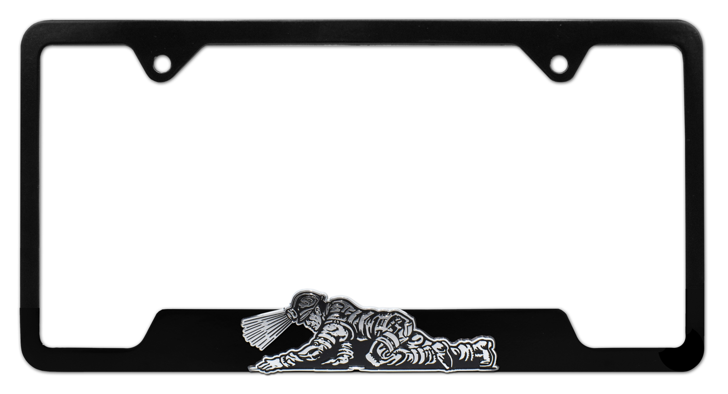 Coal Miner ALL METAL license plate frame by Elektroplate. All-metal (NOT plastic) heavy duty black license plate frame with a shiny 3D chrome emblem adhered.