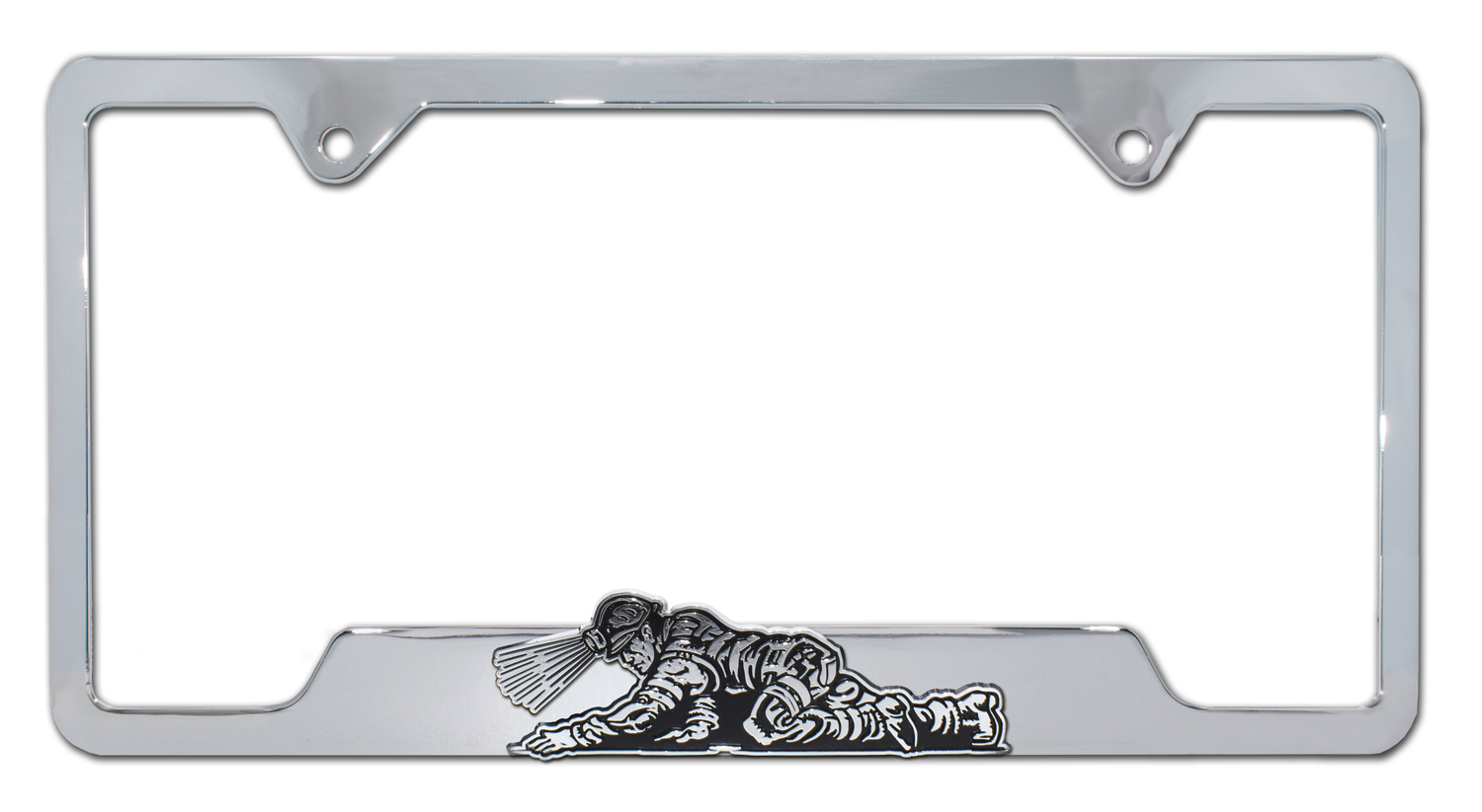 Coal Miner ALL METAL license plate frame by Elektroplate. All-metal (NOT plastic) heavy duty chrome license plate frame with a shiny 3D chrome emblem adhered.