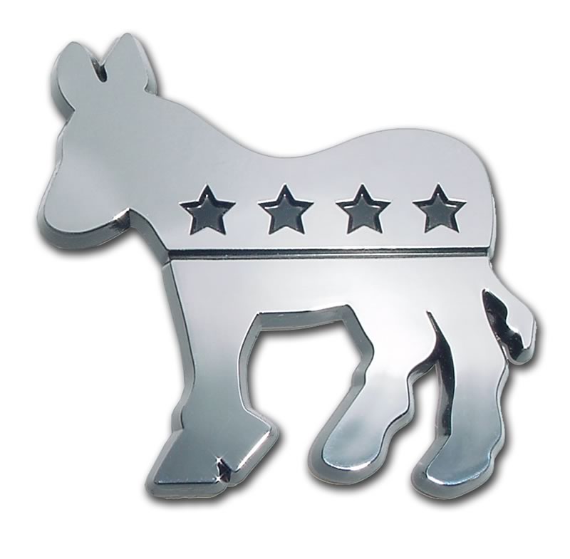 Democratic chrome auto emblem 2.75” x 2.75" x .125"). Shiny chrome guaranteed to last the lifetime of your vehicle! (Manufactured in our OEM process - ABS plastic core with a triplate chrome-plated metal finish). Attaches via a paint-safe 3M adhesive foam tape.