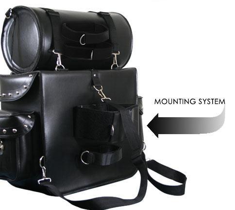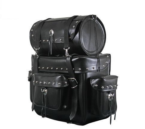 Hit the road in this awesome Waterproof Deluxe Motorcycle Touring Pack with Studs. Big and tough to carry more items with you on the road! This Deluxe Touring Pack comes in a 2 piece set, the top barrel bag measures 17 inches in length and 9.5 inches in diameter, the large bottom bag measures 18.5 inches in length, 14 inches in height and 9 inches in depth, features one large front pocket and two side pockets, all pockets feature Velcro closure, includes a rain cover, made of durable PVC material, waterproof, and has it's own mounting system to securely attach to the sissy bar.
