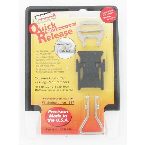 The ECHO Quick Release has been on the market since 1987. It has proven to be a reliable, fast and convenient way to fasten and unfasten the chinstrap of a safety helmet. The product has EXCEEDED the testing standards of D.O.T. 218, Snell (M2005) and N.I.J. 0104.02.