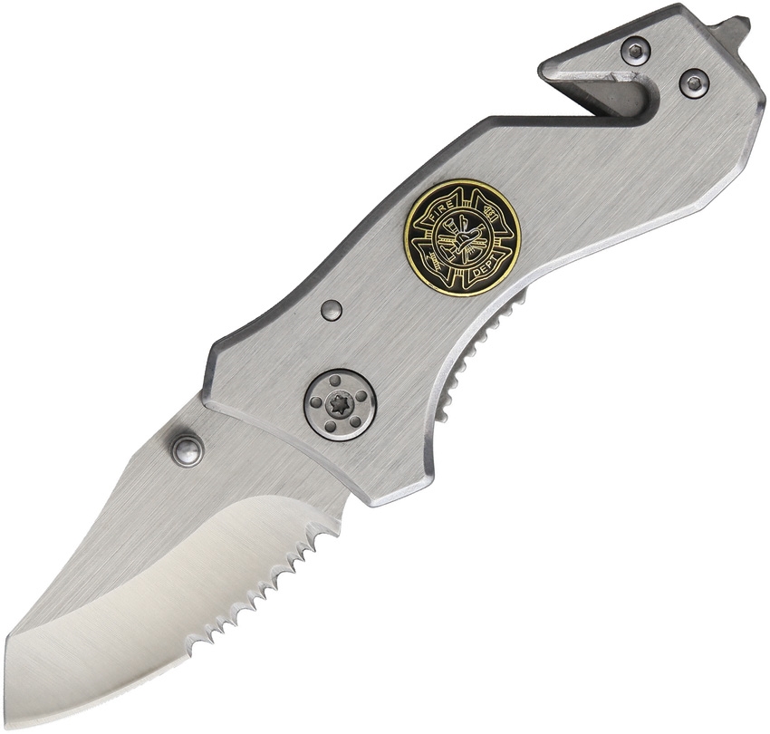 3.5" closed. 2.25" satin finish partially serrated stainless blade. Brushed stainless handle. Inlay shield. Glass breaker. Belt/cord cutter. Thumb stud. Pocket clip. Boxed.