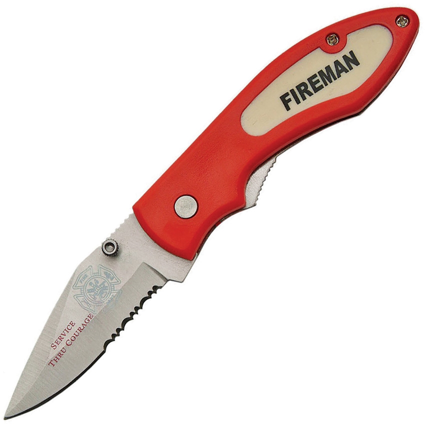 4.25" closed. 3" satin finish partially serrated stainless clip point blade. Red synthetic handle. Thumb stud. Pocket clip. Blade etching. Boxed.
