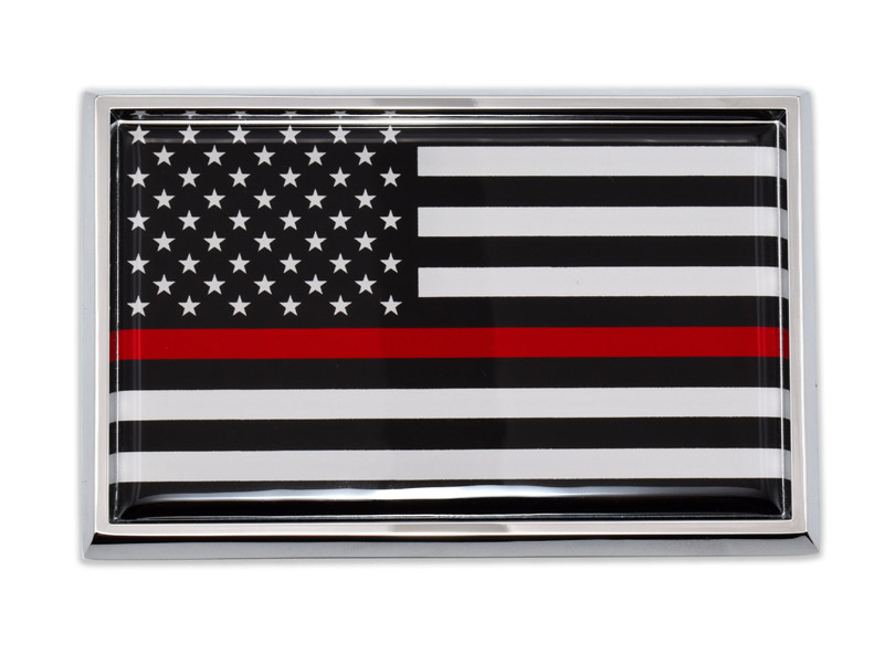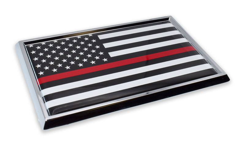 Firefighter USA Flag shiny chrome auto emblem - (3.75” x 2.5” x .125”) by Elektroplate. This universal size is great for all applications. All-metal (NOT plastic) with a chrome-plated frame and a full-color domed decal insert. The decal is UV-protected with a laminated 1/8” thick PVC made to withstand any outdoor conditions. The emblem attaches via paint-safe 3M adhesive foam tape.