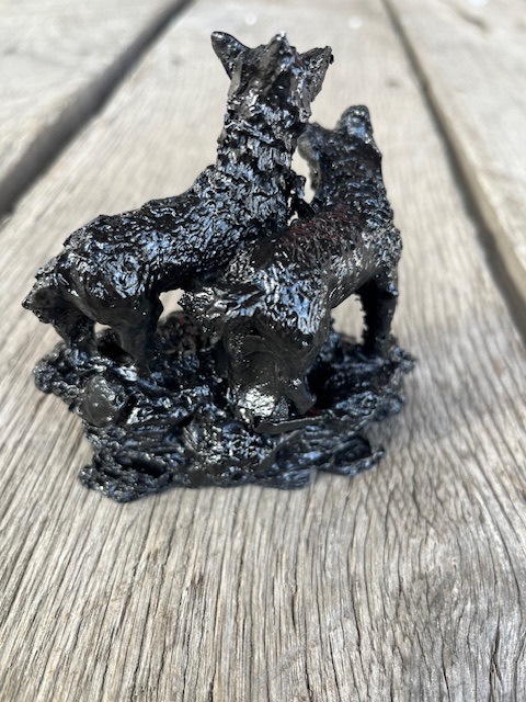 This beautiful piece of art is handcrafted by skilled artisans from Kentucky using coal. The two wolves are a symbol of strength, loyalty, and family. The craftsmanship of this item is exceptional, and you can see the attention to detail in every aspect of the design. The item is made in the United States, and it makes a great addition to any home decor. The coal material makes it unique and adds character to the piece. This is a great gift for anyone who appreciates handcrafted items. 4"