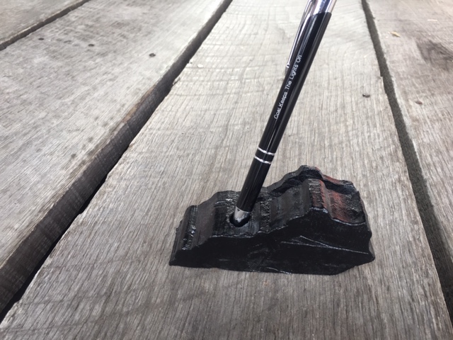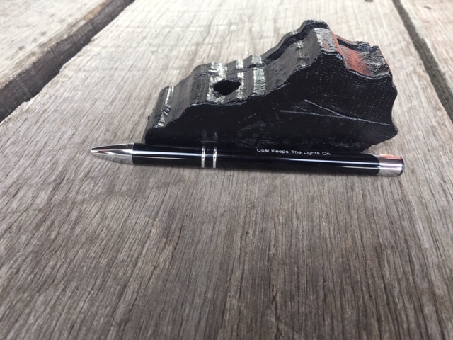 This beautiful desk set is a true Kentucky treasure, handcrafted by local artisans with a unique twist - the ink pen states "Coal Keeps The Lights On" and the base is made from coal! The attention to detail is exceptional, making each piece truly one-of-a-kind. Perfect for adding a touch of Kentucky charm to your home or office decor, this set includes a pen holder and a letter opener, both made with the same care and precision. Whether you're a collector of unique artisan pieces or simply looking for a special gift, this Kentucky desk set is sure to impress. 4 1/2" X 2 1/2" X 1 1/2"