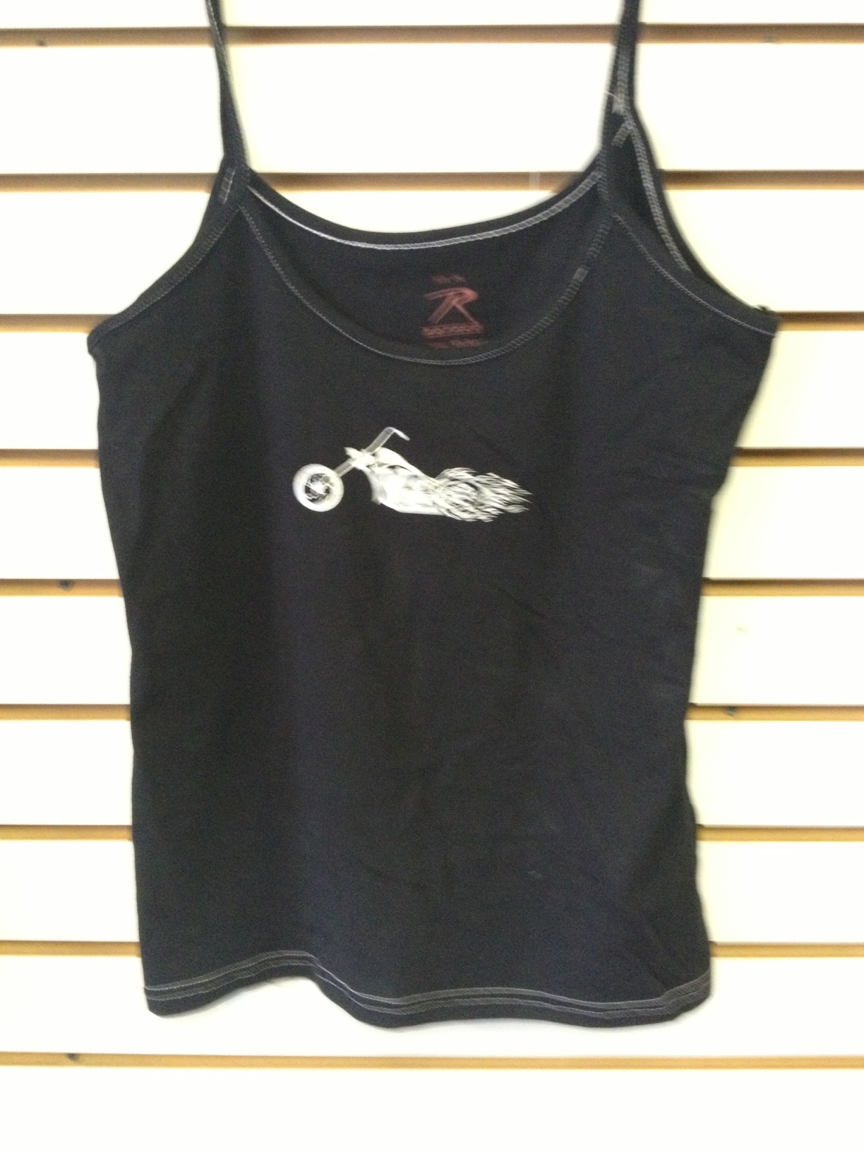 BLACK w/WHITE STITCHING AND SILVER METALLIC MOTORCYCLE LOGO ON FRONT OF TANK TOP 90% Cotton 10% Spandex