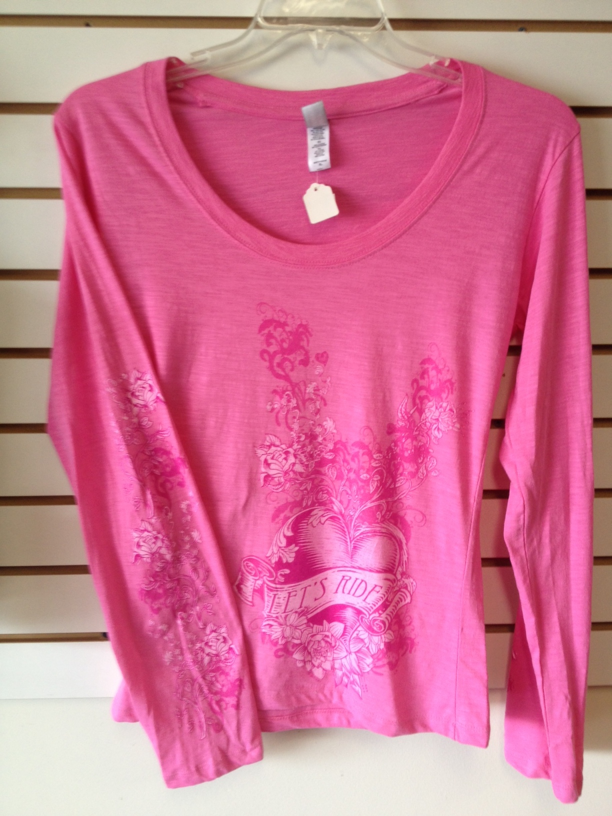 Ladies Slubby Scoop Long Sleeve 100% lightweight cotton tee with bright; full color screen print on front and sleeves. "Let's Ride" on front and floral designs on sleeves.