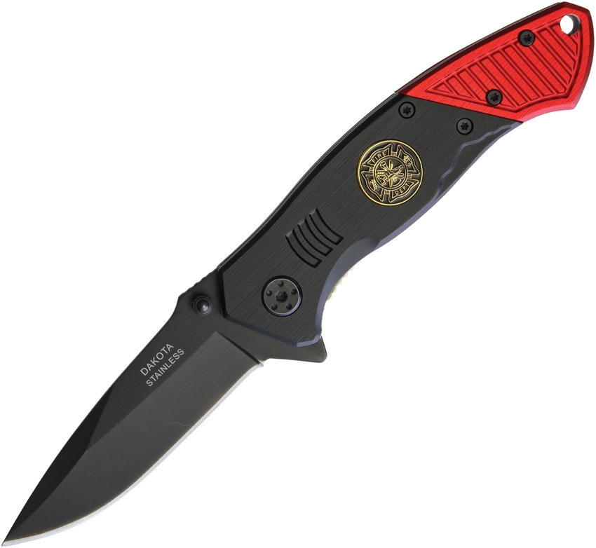 Assisted opening. 4.5" closed. 3" black finish stainless drop point blade. Black and red aluminum handle. Extended tang. Thumb stud. Pocket clip. Lanyard hole. Fire department inlay shield. Boxed.