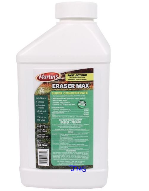 Eraser Max is ideal for fence rows, gravel paths, sidewalks, driveways, parking areas and around farm buildings and barns. One application kills weeds for up to one year. The concentrated formula of glyphosate and imazapyr is effective against most weeds, grasses, vines, brush and trees. For use on non-crop areas as a spot treatment for brush, vines and weeds or on bare ground for total vegetation control. One quart treats 4,324 square feet.