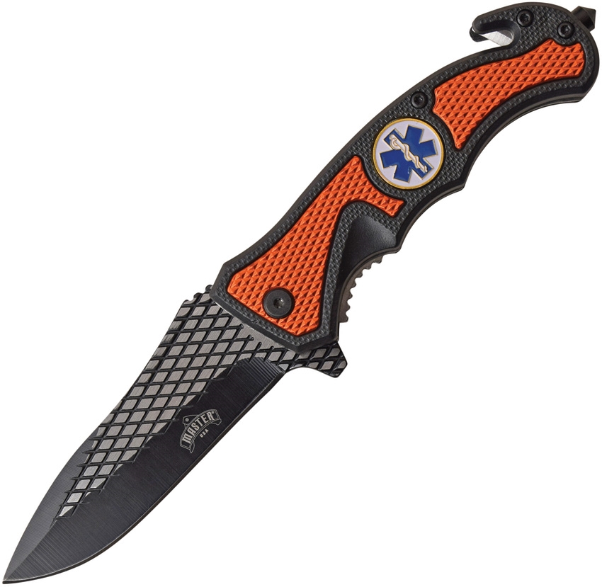 Assisted opening. 4.75" closed. 3.5" two-tone finish 3Cr13 stainless blade. Black ABS handle with orange aluminum inlay. Extended tang. Pocket clip. Glass breaker. Belt/cord cutter. Inlay shield.