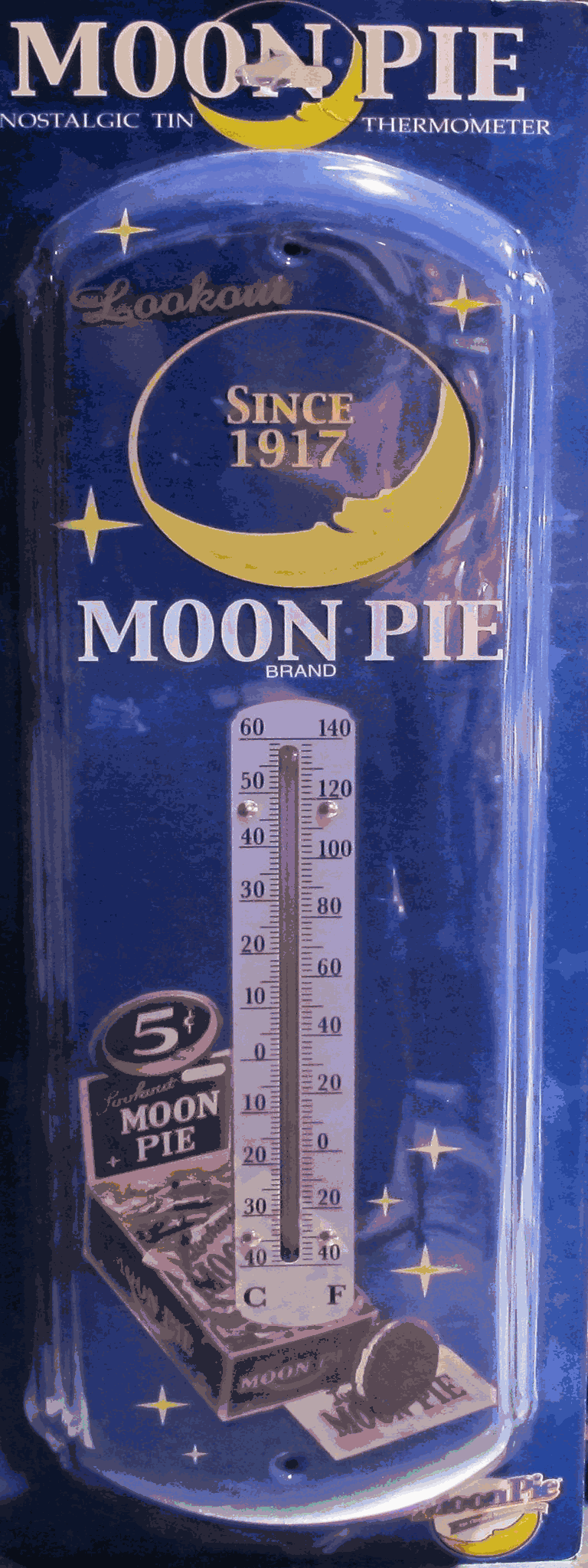 Remember when Moon Pies were only 5 cents? Well, probably not, but this nostalgic 17-inch high thermometer depicts a time when these delectable Southern treats only cost a nickel. The Moon Pie has been tickling our taste buds since 1917. Don't forget to wash it down with an RC Cola!