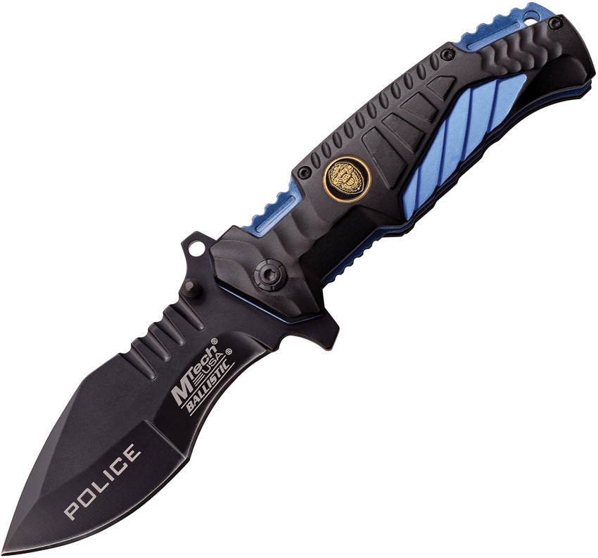 Assisted opening. 4.75" closed. 3.75" black finish stainless blade. Black and blue anodized aluminum handle. Extended tang. Inlay shield. Lanyard hole. Pocket clip. Thumb stud. Police blade etching. Boxed.
