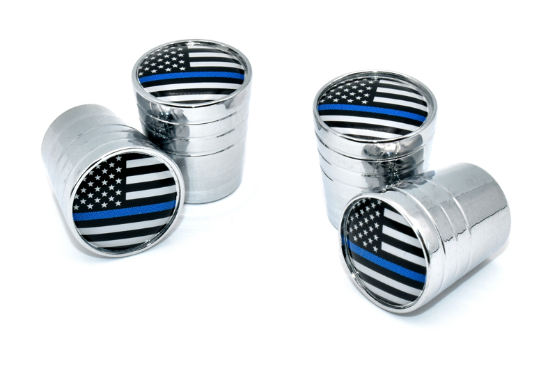 Police Flag 4-piece shiny chrome universal valve stem caps by Elektroplate. Comprised of UV-protected and scratch resistant domed graphics made in the USA. Valve caps are made of corrosion resistant, durable and lightweight aluminum. Each cap includes a high quality leakproof sealing ring to prevent pressure loss. Replace your old caps with our colorful valve stem caps. Universal fit for your car, bike, truck, trailer, bus, motorcycle, van, RV and more.