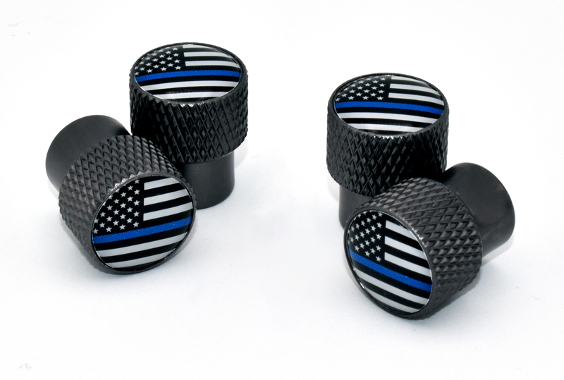 Police Blue Line 4-piece black chrome universal valve stem caps by Elektroplate. Comprised of UV-protected and scratch resistant domed graphics made in the USA. Valve caps are made of corrosion resistant, durable and lightweight aluminum. Each cap includes a high quality leakproof sealing ring to prevent pressure loss. Replace your old caps with our colorful valve stem caps. Universal fit for your car, bike, truck, trailer, bus, motorcycle, van, RV and more.