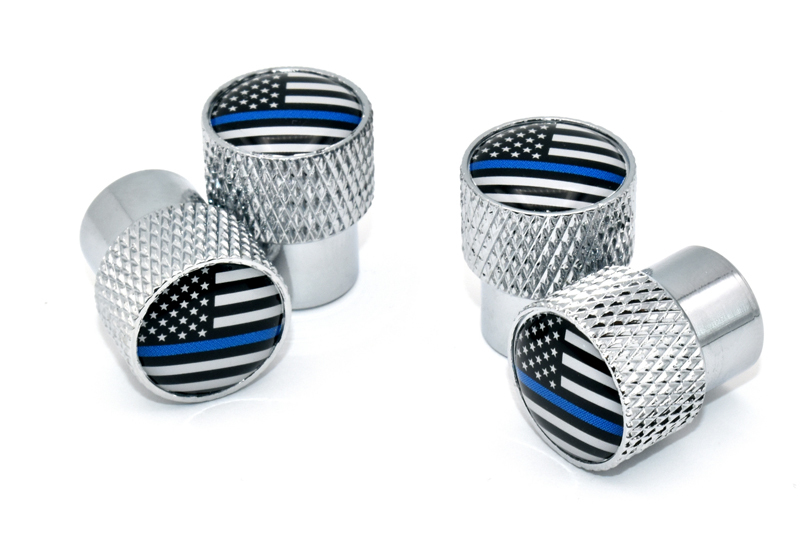 Police Blue Line 4-piece shiny chrome universal valve stem caps by Elektroplate. Comprised of UV-protected and scratch resistant domed graphics made in the USA. Valve caps are made of corrosion resistant, durable and lightweight aluminum. Each cap includes a high quality leakproof sealing ring to prevent pressure loss. Replace your old caps with our colorful valve stem caps. Universal fit for your car, bike, truck, trailer, bus, motorcycle, van, RV and more.
