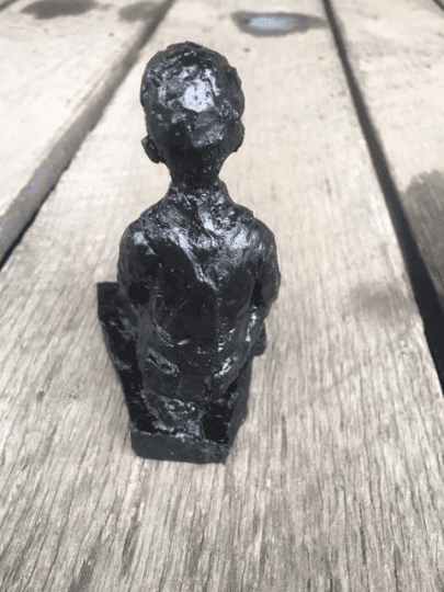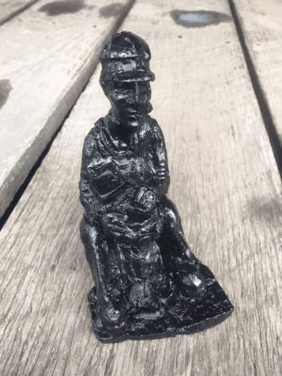 This handcrafted sitting miner figurine is a unique and beautiful piece made by skilled artisans from Kentucky. It is made from coal, giving it a rustic and earthy feel that would make a great addition to any table or home décor. The details are exquisite, from the miner's clothing to the tools he's holding, making it a true work of art. This item is perfect for collectors or anyone who appreciates handcrafted pieces. Don't miss the chance to own this one-of-a-kind figurine. 6" x 3"