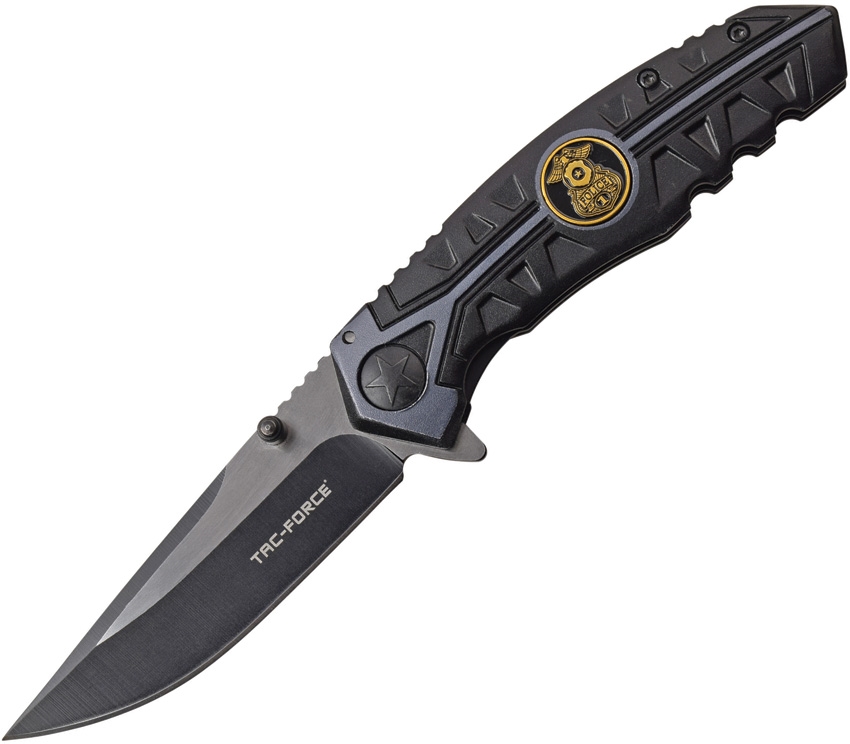 Assisted opening. 4.5" closed. 3.5" two-tone finish 3Cr13 stainless blade. Black and blue aluminum handle. Extended tang. Thumb stud. Pocket clip. Police Department inlay shield. Boxed.