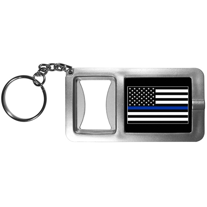 Never be without light with our Thin Blue Line Police Flag flashlight keychain that features a handy bottle opener feature. This versatile key chain is perfect for camping and travel.