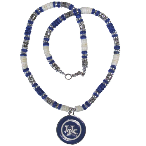 Our officially licensed college shell necklaces have an 18" shell chain with alternated team colored shells and a hand enameled Kentucky Wildcats emblem.