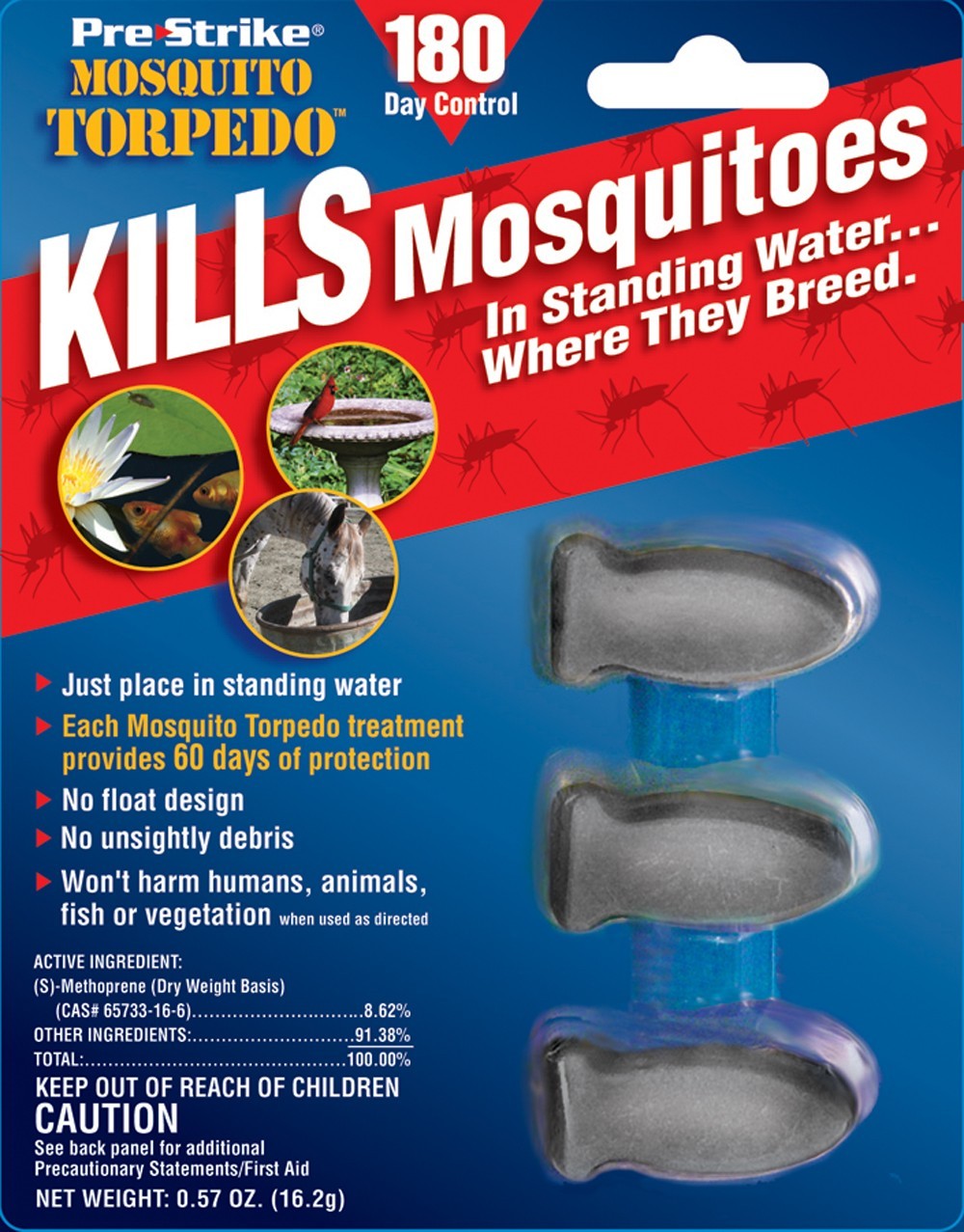 Pre-Strike Mosquito Torpedo is an easy and effective way to kill developing mosquitoes in standing water before they become breeding, biting adults. Mosquito Torpedo, dropped into standing water, sinks to the bottom and leaves it crystal clear. Once there it slowly and continuously releases an Insect Growth Regulator (IGR) into the water to prevent mosquitoes from developing for up to two months. Mosquito larvae exposed to treated water will die in the pupal stage before they reach adulthood.
